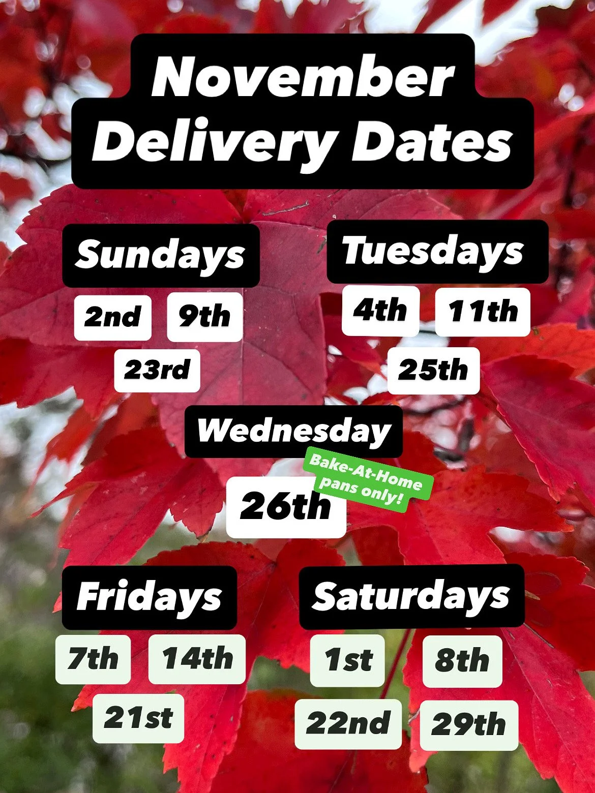 All deliveries take place between 7-11am on delivery days unless otherwise noted.